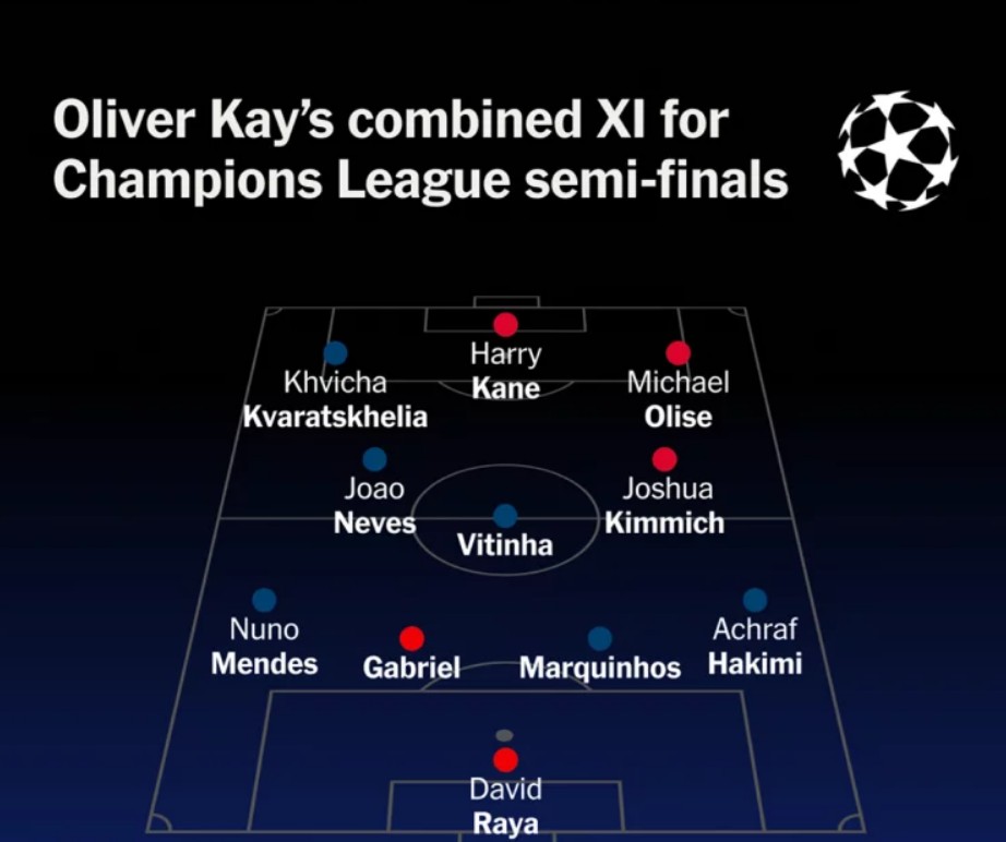 ჩემპიონთა ლიგის ნახევარფინალური ეტაპის დაწყებამდე ავტორიტეტულმა სპორტულმა გამოცემამ, The Athletic-მა, საინტერესო სტატია გამოაქვეყნა. The Athletic-ის ჟურნალისტებმა ნახევარფინალში გასული გუნდებიდან („ბაიერნი“, „არსენალი“, „ატლეტიკო“, „პარი სენ-ჟერმენი) გაერთიანებული თერთმეტეული შეადგინეს და ყველა მათგანმა მარცხენა გარემარბის პოზიციაზე ხვიჩა კვარაცხელია დააყენა.