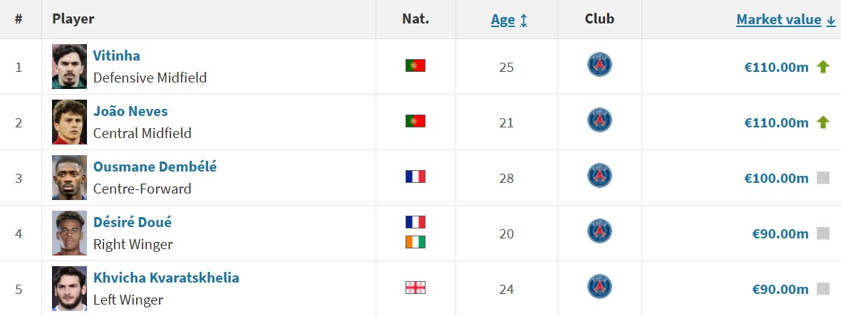 Tranfermarkt-ის განახლებული მონაცემების მიხედვით, პსჟ-ს ქართველი შემტევი, ხვიჩა კვარაცხელია ლიგა 1-ის ტოპ 5 ყველაზე ძვირადღირებულ ფეხბურთელს შორისაა.