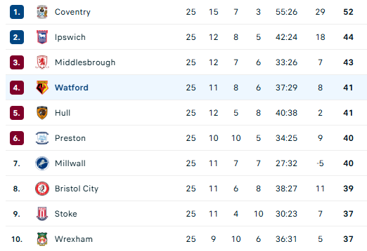 ინგლისის ჩემპიონშიფის 25 ტურის შემდეგ გიორგი ჩაკვეტაძე უოტფორდი მეოთხე პოზიციაზე იმყოფება.