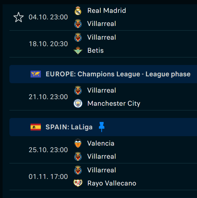 გთავაზობთ "ვილიარეალის" მომდევნო 5 მატჩის კალენდარს.