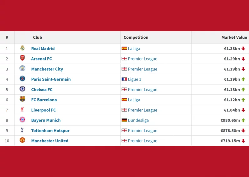 რეიტინგის პირველ ადგილს მადრიდის „რეალი“ იკავებს. „სამეფო კლუბის“ ფეხბურთელთა საბაზრო ღირებულების ჯამი Transfermarkt-ზე 1.38 მილიარდ ევროს შეადგენს.