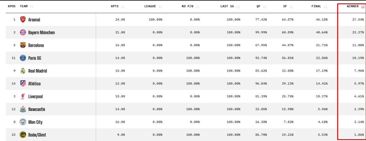 ჩემპიონობის მთავარ ფავორიტად ისევ არსენალი რჩება (27,54%), მეორე ადგილზე მიუნხენის ბაიერნია (22,37%), მესამე პოზიციაზე კი ლივერპული ბარსელონამ (11%) ჩაანაცვლა.
